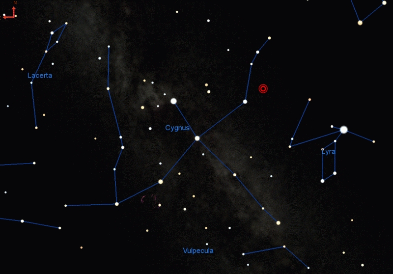 Je pod pravým ramenem Severního kříže - křídlem souhvězdí Labutě na pozadí Mléčné dráhy.